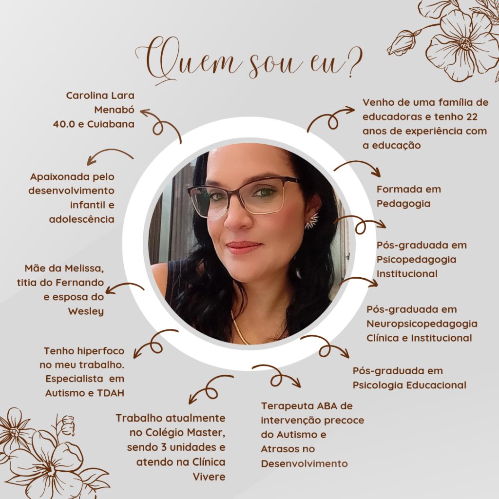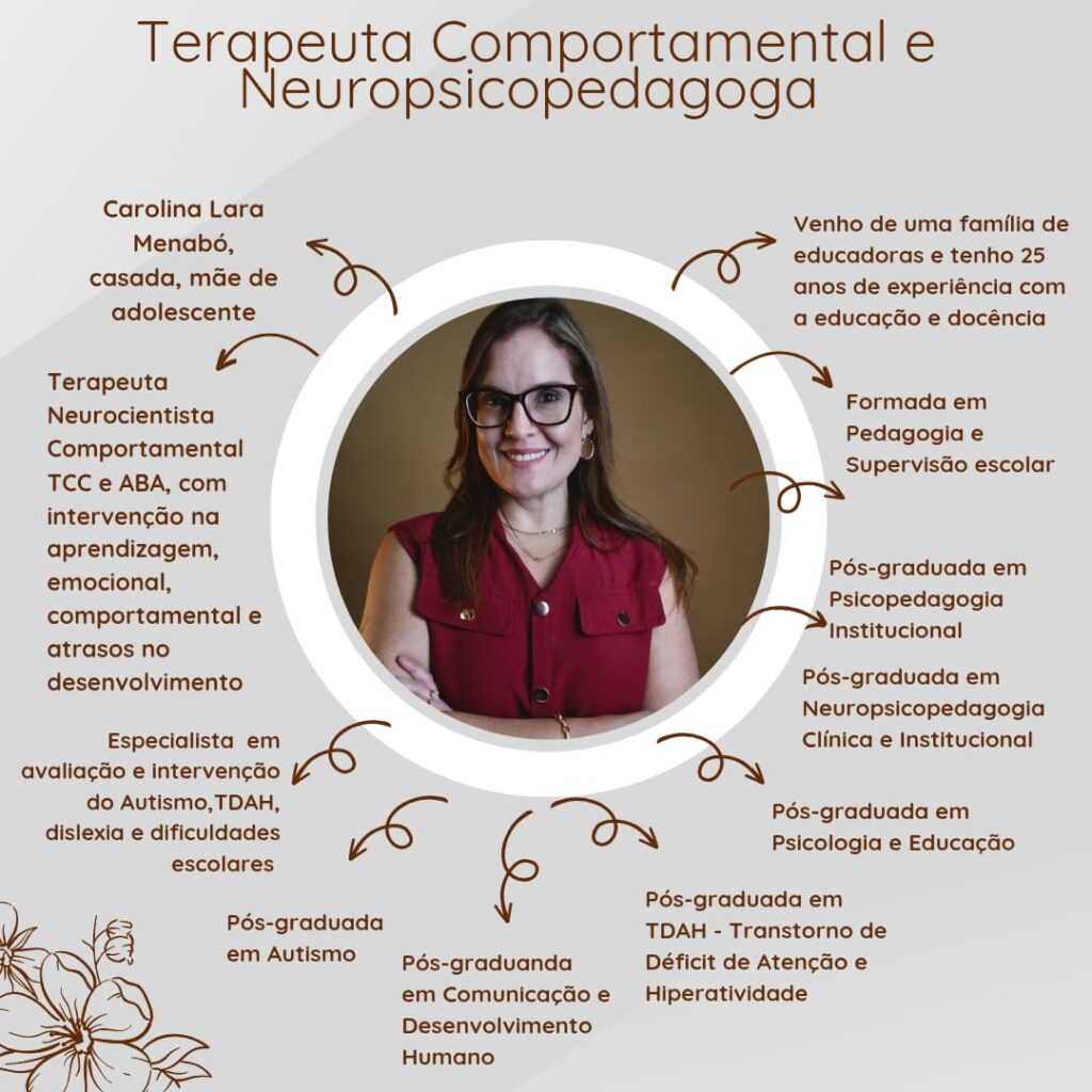 Olá, me chamo Carolina, sou Pedagoga com ênfase em Supervisão Escolar, Psicopedagoga Institucional, Neuropsicopedagoga Clínica/Institucional, Pós- graduada em Psicologia Educacional, Pós-graduada em TDAH (Transtorno de Déficit de Atenção e Hiperatividade), Pós-graduanda em TEA (Transtorno do Espectro Autista), Terapeuta Comportamental ABA (Applied Behavior Analysis) – Análise do Comportamento Aplicada. Realizo investigação das causas das dificuldades pedagógicas, emocionais, comportamentais, Autismo, TDAH, TOD, Altas habilidades, Atrasos no Desenvolvimento Infantil e será um prazer ajudar seu filho(a) ou até mesmo você a desenvolver potenciais.